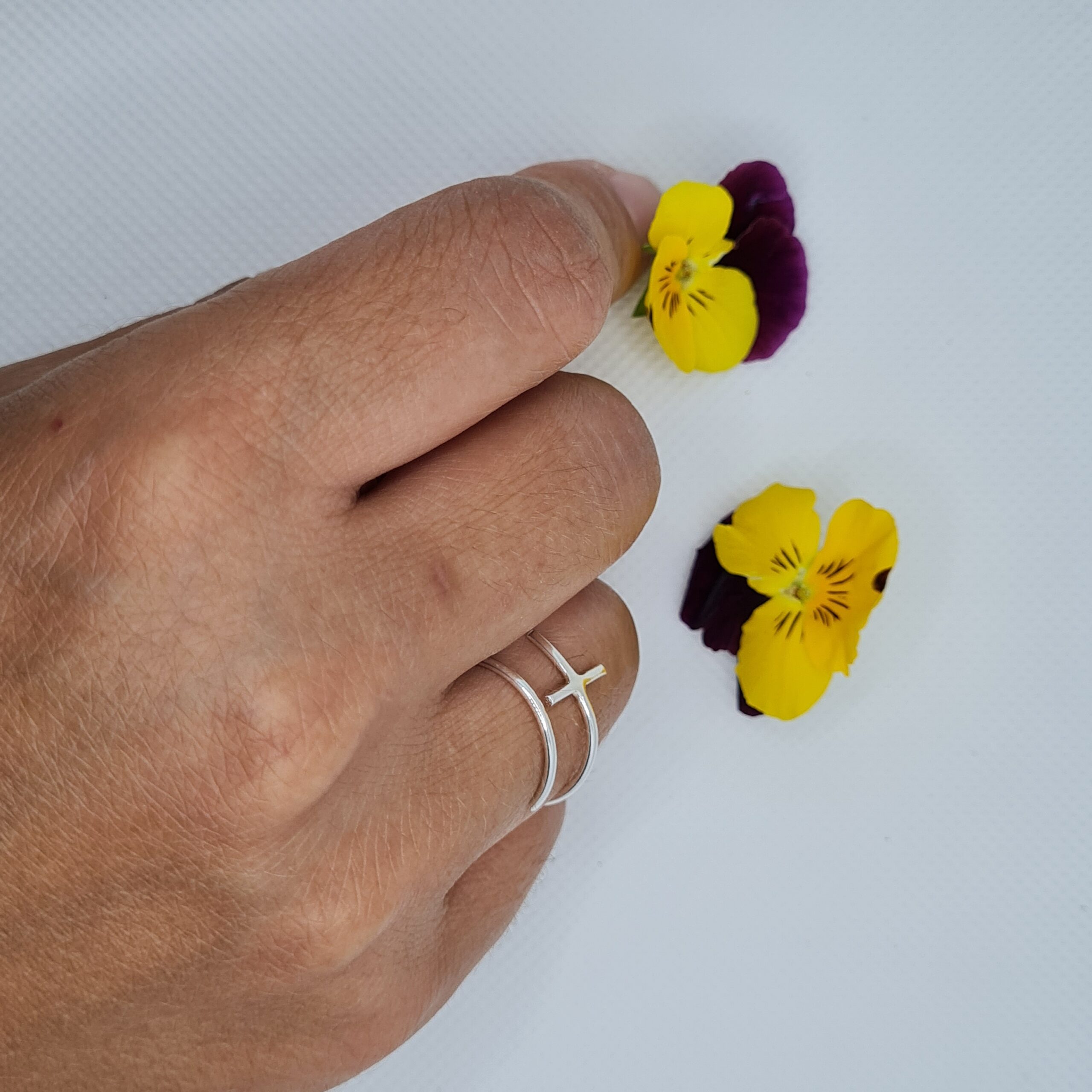 Este precioso anillo de Cruz en diseño minimalista está a la vanguardia de la moda. Es ajustable y muy versátil.